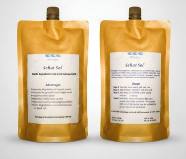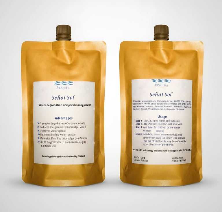Sehat Sol is a scientifically tailored consortium of bacteria (Bacillus megaterium, B. cereus and Marinobacter sp.), isolated from marine environment, and a soup of hydrolytic enzymes (protease, lipase, chitinase, laminarinase, and phosphatase)