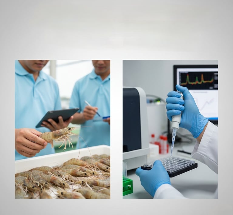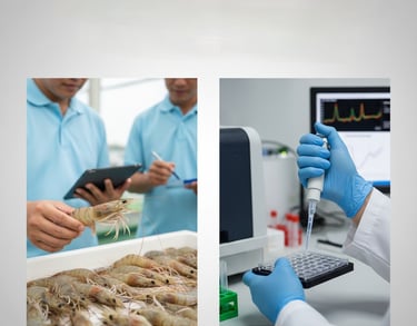 Animal Health Assessment involves thorough monitoring of shrimp and fish for signs of stress, disease, and overall well-being.